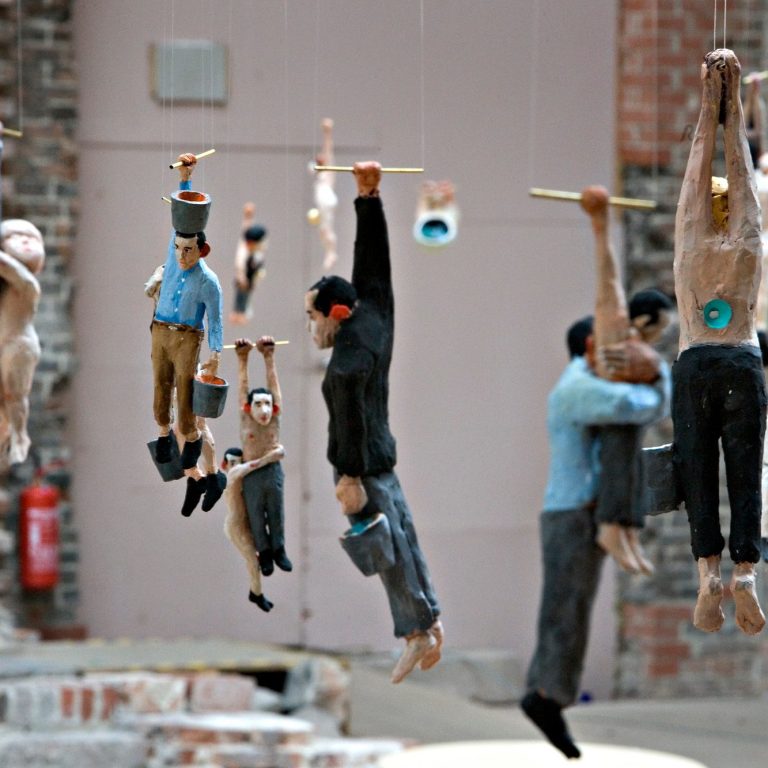 Volker März ist ein politisch denkender und konzeptuell arbeitender Künstler, der seine Reflexionen in einem erzählerischen Rahmen vor uns ausbreitet. Ganz im Sinne seiner gesellschaftlichen Themen beschränkt er sich dabei nicht auf eine Kunstgattung, sondern arbeitet spartenübergreifend in Bildender Kunst, Musik und Literatur. Er beobachtet die gesellschaftlichen Veränderungen genau und kommentiert sie mit seinen farbigen Tonfiguren.